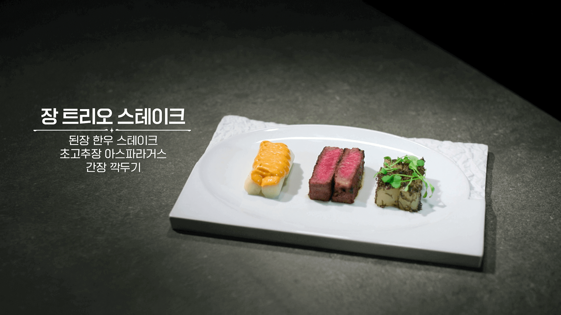 최현석 셰프의 맞상대는 원투쓰리 셰프가 되었습니다. 원투쓰리 셰프의 미슐랭 1,2,3 레스토랑에서 모두 근무해 본 경력이 있는 실력파이고, 요리스타일도 최현석 셰프와 유사한 파인 다이닝 스타일이었기 때문에 둘의 대결은 시작 전부터 흥미진진했습니다. 둘에게 주어진 공통의 재료는 된장, 고추장, 간장을 사용하는 장 트리오였습니다. 그리고, 완성된 요리는 최현석 셰프는 장 트리오 스테이크이고, 원투쓰리 셰프는 제주 장 트리오였습니다.